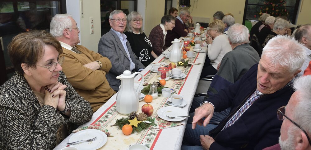 Bei Kaffee, Kuchen, Mettbrötchen und Weihnachtsplätzchen verbrachten die Seniorinnen und Senioren frohe Stunden in geselligen Runde. Begleitet wurden sie vom stellvertretenden Vorsitzenden René Bertram, der auf seinem Akkordeon Weihnachtslieder intonierte. Außerdem trugen Mitglieder weihnachtliche Texte vor. So erfuhren die Besucher, wie ein Opa den „Chressboom“ unter der Wirkung einer von ihm geleerten Flasche Cognac mit Karnevals-Utensilien einschließlich seiner Präsidentenmütze schmückte. Sie hörten eine Drei-Königs-Geschichte aus Russland und erhielten Erläuterungen zum astronomischen Hintergrund des „Sterns von Betlehem“.